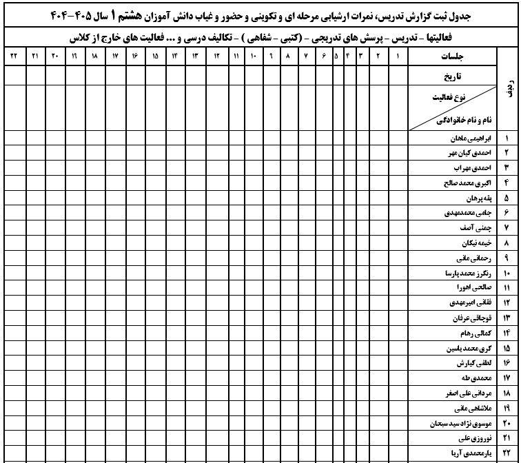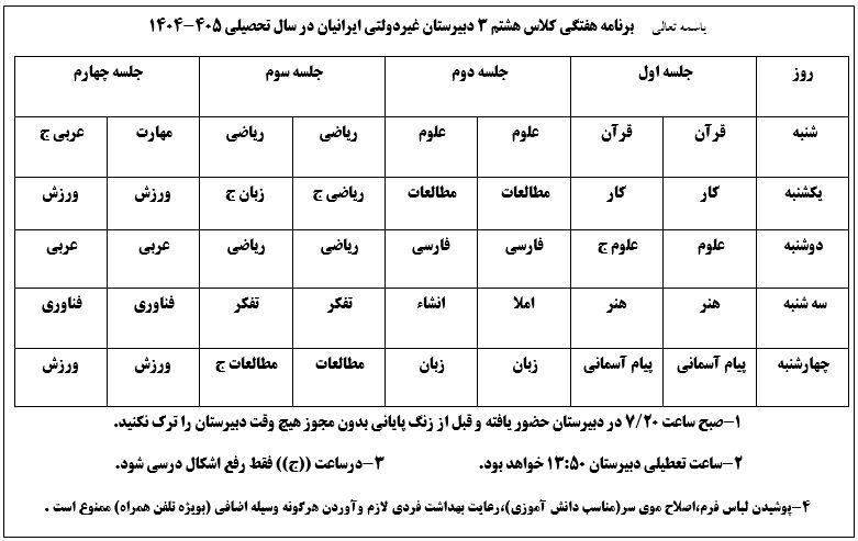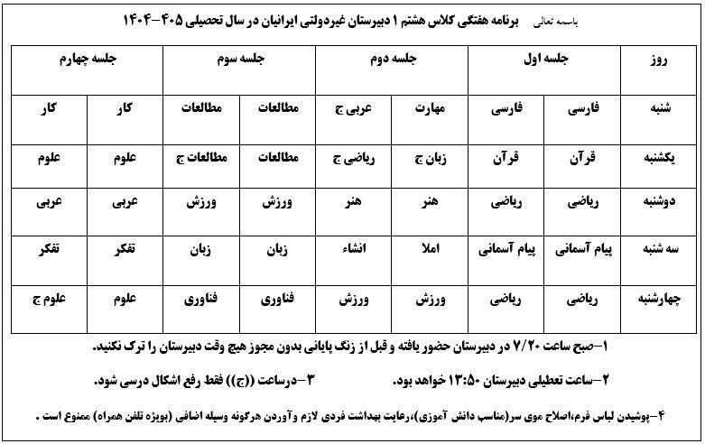 لیست کلاسی و برنامه هفتگی پایه هشتم