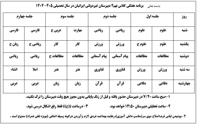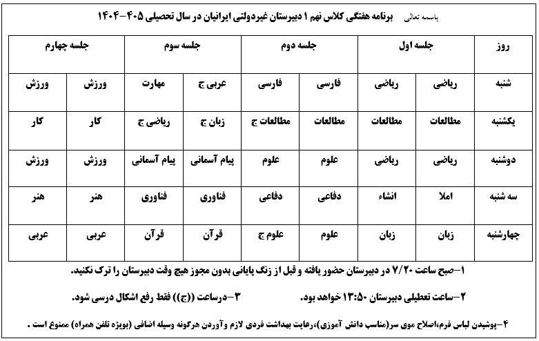 لیست کلاسی و برنامه هفتگی پایه نهم